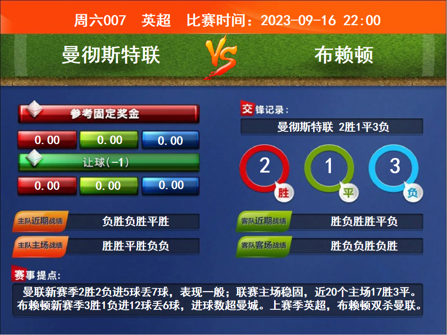 比賽時間:2023-09-16 22:00賽事提點:曼聯(lián)新賽季2勝2負進5球丟7球,表現(xiàn)一般;聯(lián)賽主場穩(wěn)固,近20個主場17勝3平。布賴頓新賽季3勝1負進12球丟6球,進球數(shù)超曼城。上賽季英超,布賴頓雙殺曼聯(lián)。