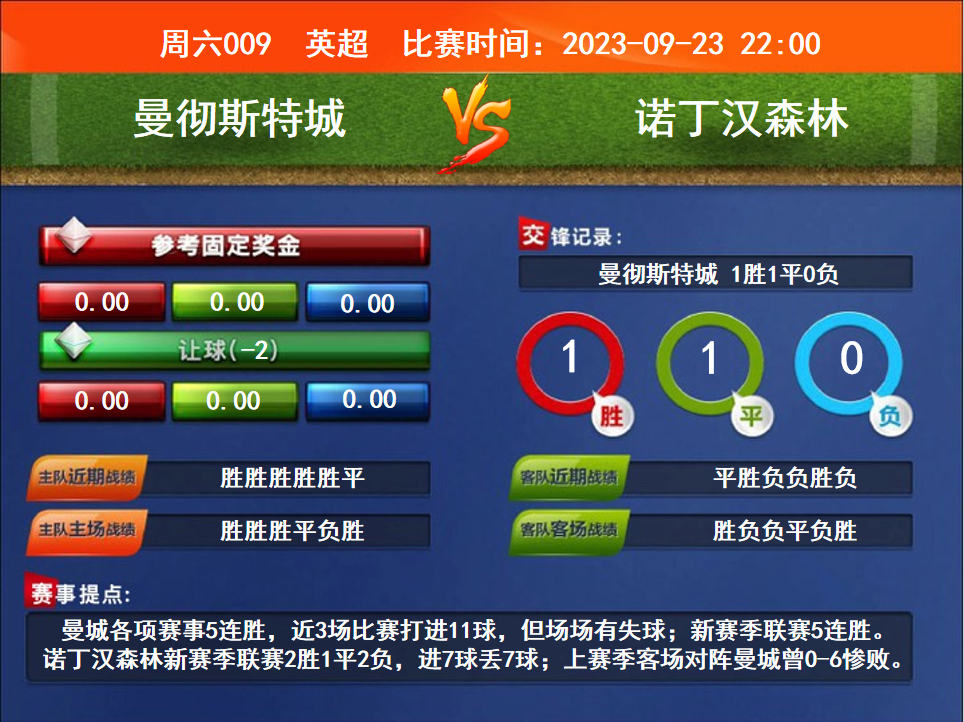 比賽時(shí)間:2023-09-23 22:00賽事提點(diǎn):曼城各項(xiàng)賽事5連勝,近3場比賽打進(jìn)11球,但場場有失球;新賽季聯(lián)賽5連勝。諾丁漢森林新賽季聯(lián)賽2勝1平2負(fù),進(jìn)7球丟7球;上賽季客場對(duì)陣曼城曾0-6慘敗。