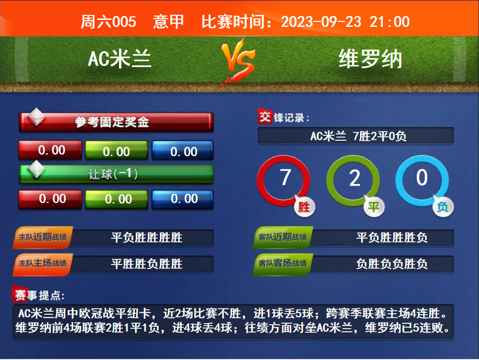 比賽時(shí)間:2023-09-23 21:00賽事提點(diǎn):AC米蘭周中歐冠戰(zhàn)平紐卡,近2場比賽不勝,進(jìn)1球丟5球;跨賽季聯(lián)賽主場4連勝。維羅納前4場聯(lián)賽2勝1平1負(fù),進(jìn)4球丟4球;往績方面對(duì)壘AC米蘭,維羅納已5連敗。