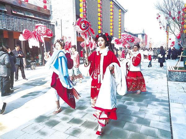 • 翠袖紅裙、直襟長袍……身著漢服的演員,手持魚燈,巡游關(guān)帝老街,伴隨著樂曲翩翩起舞,成為一道靚麗的風(fēng)景線。