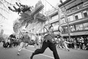 ▲2月22日, 在加拿大溫哥華, 巡游隊(duì)伍在春節(jié)狂歡游行中表演舞龍。當(dāng)日,溫哥華唐人街舉行第42屆春節(jié)大游行,本年游行的隊(duì)伍多達(dá)80支,參加表演人數(shù)超過4000人,規(guī)模是歷屆之最。游行共吸引近10萬人沿途觀看。