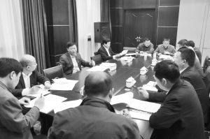 梁建松與相關(guān)單位負(fù)責(zé)同志商討縣級(jí)財(cái)政產(chǎn)業(yè)發(fā)展引導(dǎo)基金實(shí)施方案。(記者 劉俊濤 攝)
