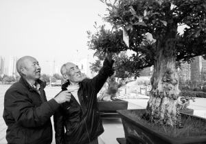 兩名老人在市體育場(chǎng)“市第四屆花卉盆景藝術(shù)展”上駐足觀看。(記者 沈湛 攝)