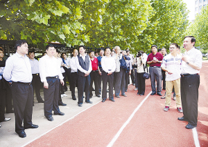 參加河南省推進(jìn)老年人體育工作現(xiàn)場會(huì)的與會(huì)人員在市領(lǐng)導(dǎo)徐光、劉繼標(biāo)等陪同下到星龍華緣小區(qū)參觀老年人健身場地。