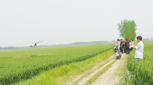 5月7日,一架小型直升機為小麥噴灑農(nóng)藥。當(dāng)前,正是小麥 “一噴三防”的關(guān)鍵時期,項城市三店鎮(zhèn)多方聯(lián)系,引進(jìn)小型直升機為小麥高產(chǎn)示范田噴灑農(nóng)藥,為豐產(chǎn)豐收奠定良好基礎(chǔ)。董方靈 攝