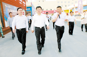 周口市委書記、市人大常委會主任徐光(中)一行在項城市委書記黃真?zhèn)ィㄗ螅┑呐阃掠^摩項目建設(shè)。