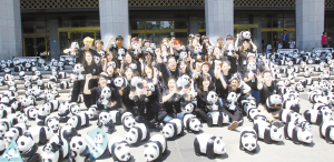 熊貓軍團“占領”首爾      5月23日,在韓國首爾,展覽工作人員與紙制大熊貓合影。當日,1600只紙制大熊貓在位于首爾市中心的世宗文化會館前亮相?!凹堉拼笮茇埵澜缰谩被顒觿?chuàng)辦于2008年,由世界自然基金會和法國藝術家保羅·格蘭金聯(lián)合發(fā)起,以回收的廢紙和雞蛋殼為材料,設計制作1600只形態(tài)各異、表情豐富的大熊貓,目的是推廣保護大熊貓和民眾的環(huán)保意識。新華社發(fā)