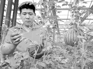 扶溝縣豫星農(nóng)業(yè)發(fā)展有限公司種植的“迷你彩虹西瓜”,以個小、皮薄、甜度高暢銷省內外,畝均收入達3萬元。圖為員工正在為“彩虹西瓜”整枝打杈。(谷志方 攝)