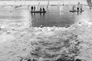 由于前幾天的雨雪天氣,我市的氣溫下降了不少,沙潁河邊更是寒風(fēng)凜冽,但這絲毫沒有減弱冬泳愛好者的熱情。青年男子組30米往返賽率先開始。有的冬泳愛好者似乎有點(diǎn)緊張,還沒聽到發(fā)令槍響就跳入水中,結(jié)果被裁判叫回重新比賽。和冬泳愛好者的緊張心情不同,圍觀市民則顯得比較悠閑,他們有的在討論比賽的技巧,有的則在不停地為選手加油助威。