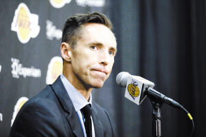 當(dāng)?shù)貢r(shí)間3月24日,納什在新聞發(fā)布會(huì)上。當(dāng)日,洛杉磯湖人隊(duì)球員斯蒂夫·納什召開(kāi)新聞發(fā)布會(huì),就退役一事回答記者提問(wèn)。納什于21日通過(guò)網(wǎng)絡(luò)宣布了自己退役的消息。新華社發(fā)