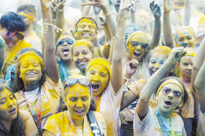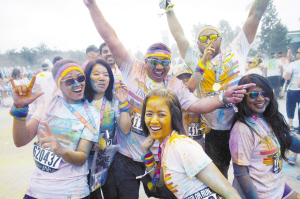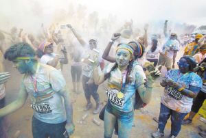 當(dāng)?shù)貢r(shí)間6月13日,在美國(guó)洛杉磯,約萬(wàn)名跑步愛(ài)好者在洛杉磯道奇球場(chǎng)外參加“彩色跑”活動(dòng)?!安噬堋笔且豁?xiàng)娛樂(lè)跑步項(xiàng)目,全程為5公里,每公里設(shè)置一個(gè)彩色站,當(dāng)參與者跑至彩色站時(shí),由志愿者向參與者拋灑彩色粉末。與傳統(tǒng)跑步競(jìng)速相比,“彩色跑”活動(dòng)雖然沒(méi)有贏家或獎(jiǎng)品,但強(qiáng)調(diào)“參與、娛樂(lè)和色彩”的重要性。